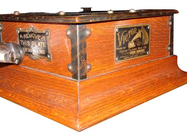 Golden oak case with corner braces.